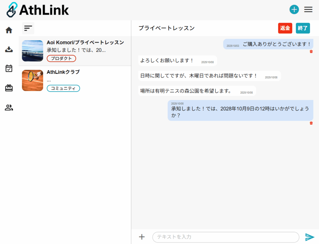 購入時の料金はアスリートの決済アカウントに入金され、購入後にはプロダクト専用チャットにて購入者とやり取りをします。
